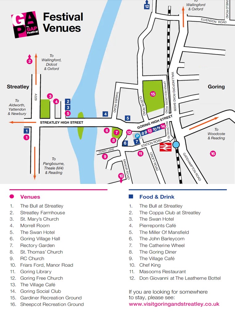 Plan your journey to The GAP Festival with details on where to park, how to reach the venues by road and train, as well as information on disabled access in Goring and Streatley villages.